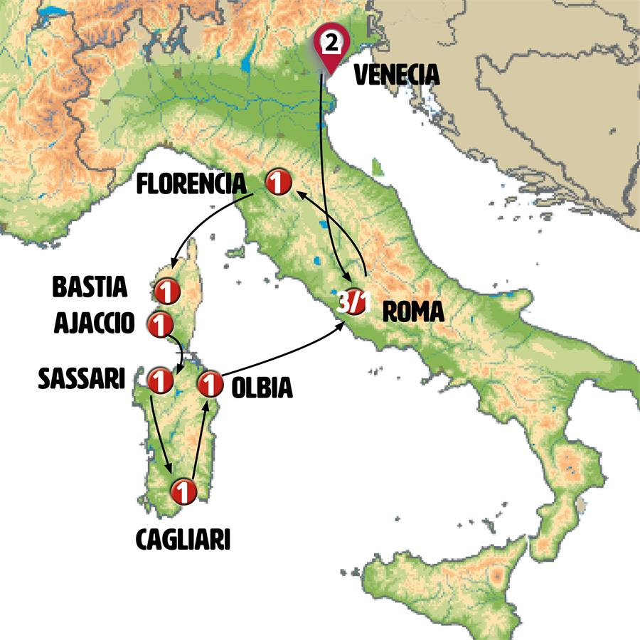 Nota: En ocasiones, según las condiciones del mar, el ferry puede sufrir retrasos. En ese caso, podríamos no visitar (por falta de tiempo y luz solar) Palau y La Maddalena, sustituyendo la visita por Porto Cervo, el corazón de la Costa Esmeralda. En retrasos excepcionalmente raros, podríamos ir directamente a Sassari sin visitar estos puntos, o incluso pernoctar en Bonifacio y salir hacia Cerdeña a primera hora del día siguiente.