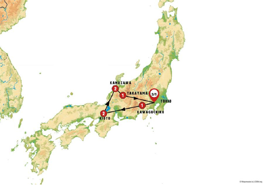Nota: En el Ryokan previsto algunas habitaciones son de estilo japonés, alojamiento en tatamis y otras de estilo occidental. En algunas ocasiones, el alojamiento podrá ser dado en hotel tipo occidental.